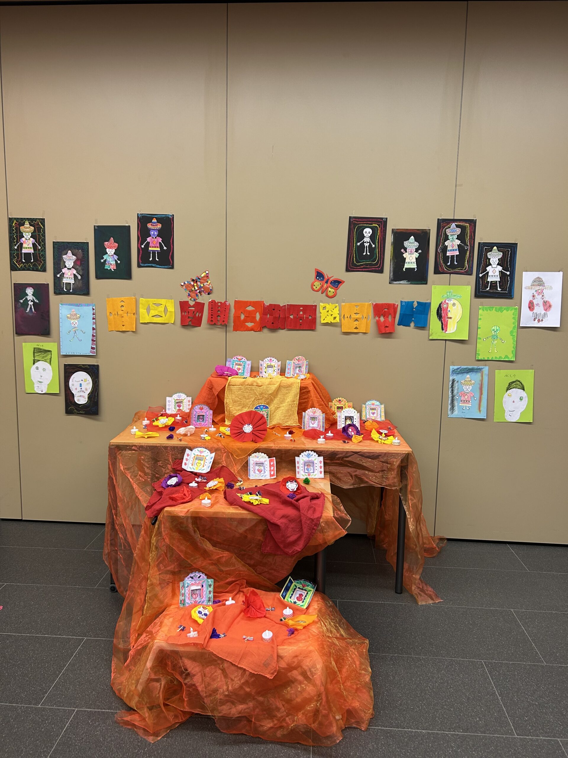 Die Kinder haben mit viel Freude und Kreativität bunte Dekorationen gebastelt – darunter farbenfrohe Papierblumen und Totenköpfe. Gemeinsam haben wir getanzt, gesungen und uns an Menschen erinnert, die nicht mehr bei uns sind. Viele Kinder brachten Fotos von verstorbenen Familienmitgliedern oder Tieren mit, die wir in einer liebevoll gestalteten Erinnerungs-Ecke aufgestellt haben.