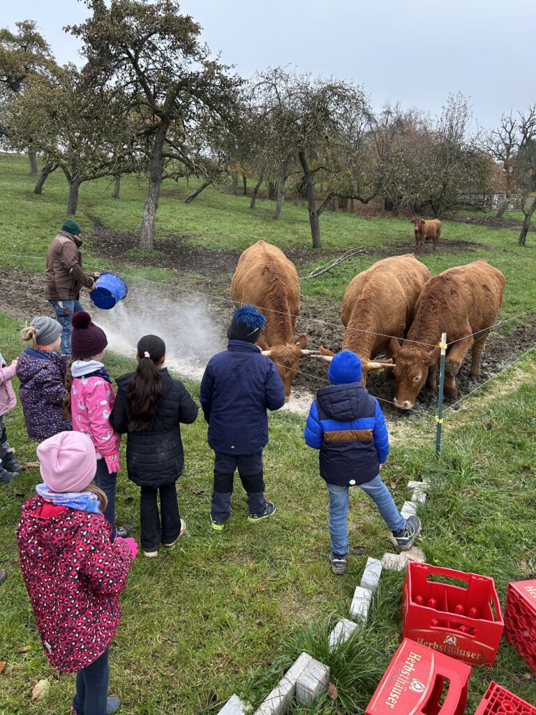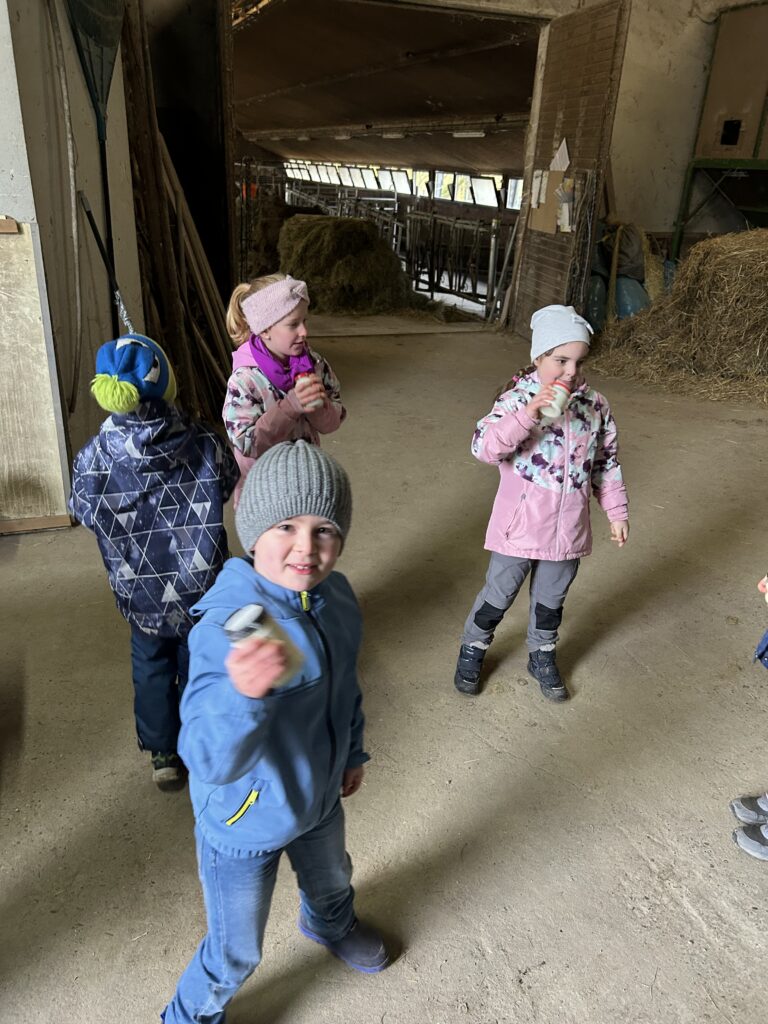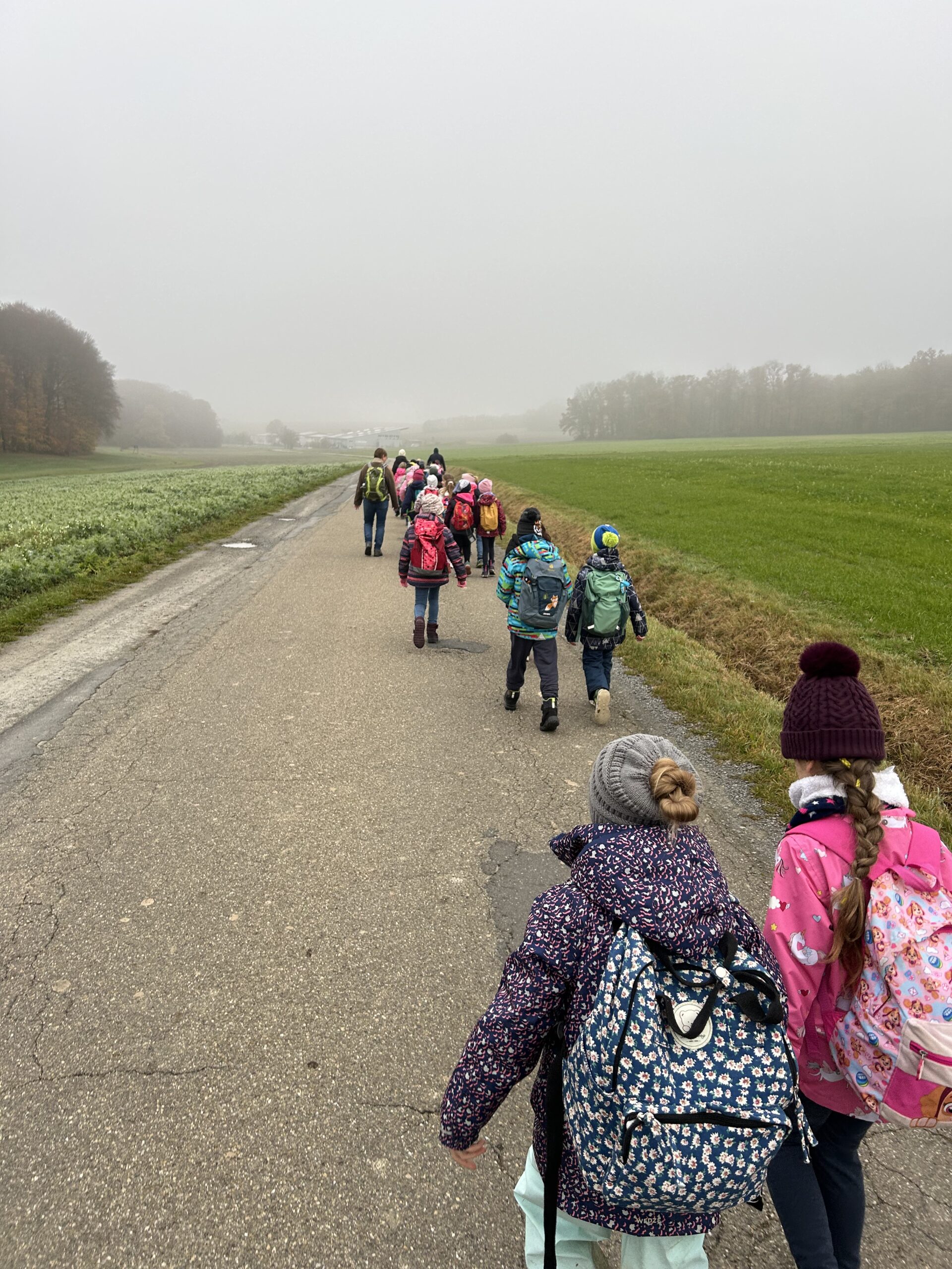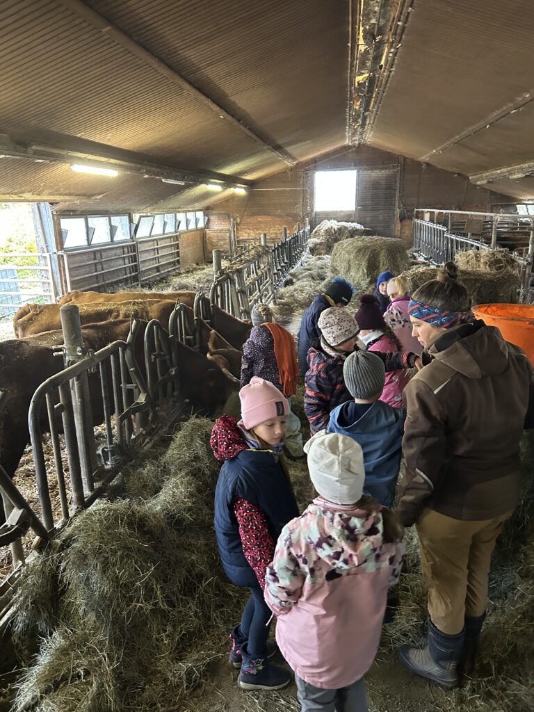 Am Freitagvormittag machten sich die Klassen 2a und 2b mit insgesamt 37 Kindern auf den Weg zu einem spannenden Ausflug auf den Wendischenhof. Mit dem Bus fuhren wir zunächst von Mulfingen nach Weldingsfelden, wo uns bereits Herr Karle erwartete. Von dort aus wanderten wir – trotz des kalten Wetters – gemeinsam zum Hof.