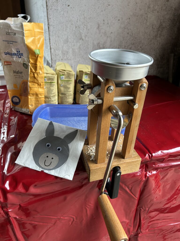 Am Wendischenhof wurden wir herzlich von Frau Karle empfangen. Nach einer kleinen Stärkung mit unserem Vesper durften wir uns über leckeren Kuchen und süßes Gebäck freuen, das Familie Karle extra für uns gebacken hatte. Danach ging es in vier Gruppen zu den verschiedenen Stationen auf dem Hof: